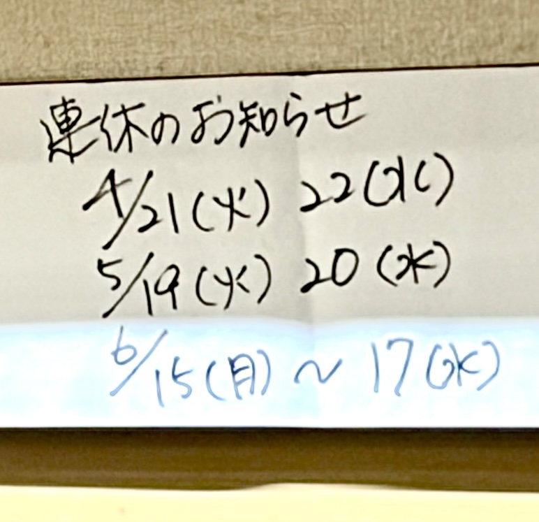 4月 8, 2026 12:00 pm お知らせ | hospitason | 0お客様各位 いつもご来店いただき有難う御座います。 2026年4~6月のお休みについて、以下の通りお知らせします。 < 休業日 > ◎ 4月 21日(火)・22日(水) ◎ 5月 19日(火)・20日(水) ◎ 6月 15日(月)~17日(水) とさせていただきます。 よろしくお願いします。 店主